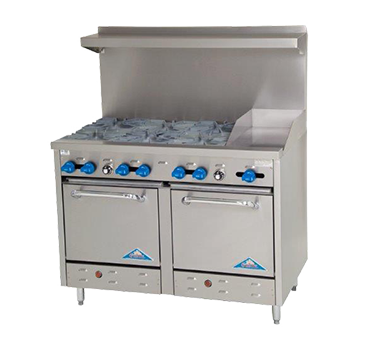 Equip your kitchen for superior culinary excellence with the Comstock-Castle F3218-12 Range. This 48" gas range is designed specifically for commercial restaurant use, offering exceptional performance and durability. With six 24000 BTU star burners and 12" square cast iron grates, this range provides precise heat distribution and maximum cooking space. The 12" - 3/4" thick griddle with manual controls adds versatility to your menu options. The two space-saver ovens feature enamel door and bottom linings, along with a rack per oven with three positions, allowing you to cook multiple dishes simultaneously. The stainless steel exterior and high shelf not only enhance the range's aesthetic appeal but also ensure easy cleaning and maintenance. With 6" stainless steel legs and a cook surface height of 37", this range offers convenience and ergonomic design. With a powerful 214000 BTU output, this NSF and cETLus certified range is a reliable and efficient addition to any commercial kitchen.