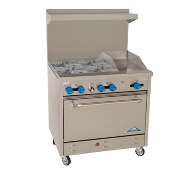 Introducing the Comstock-Castle F330-12 Range, a game-changer for commercial restaurant kitchens. With its innovative solutions for mastering the art of cuisine, this gas range is a must-have for any professional chef. Boasting a 36" wide design, it features four 24000 BTU star burners with 12" square cast iron grates, ensuring even heat distribution and precise cooking control. The range also includes a 12" - 3/4" thick griddle with manual controls, perfect for whipping up delicious breakfast favorites. The extra-wide 31" oven with enamel door and bottom linings provides ample space for baking multiple dishes simultaneously, while the included rack with three positions allows for versatile cooking options. Made with a stainless steel exterior, back riser, and high shelf, this range is not only durable but also easy to clean. With a 146000 BTU rating, this NSF and cETLus certified range delivers exceptional performance, making it a reliable choice for any commercial kitchen. Upgrade your restaurant's cooking capabilities with the Comstock-Castle F330-12 Range.